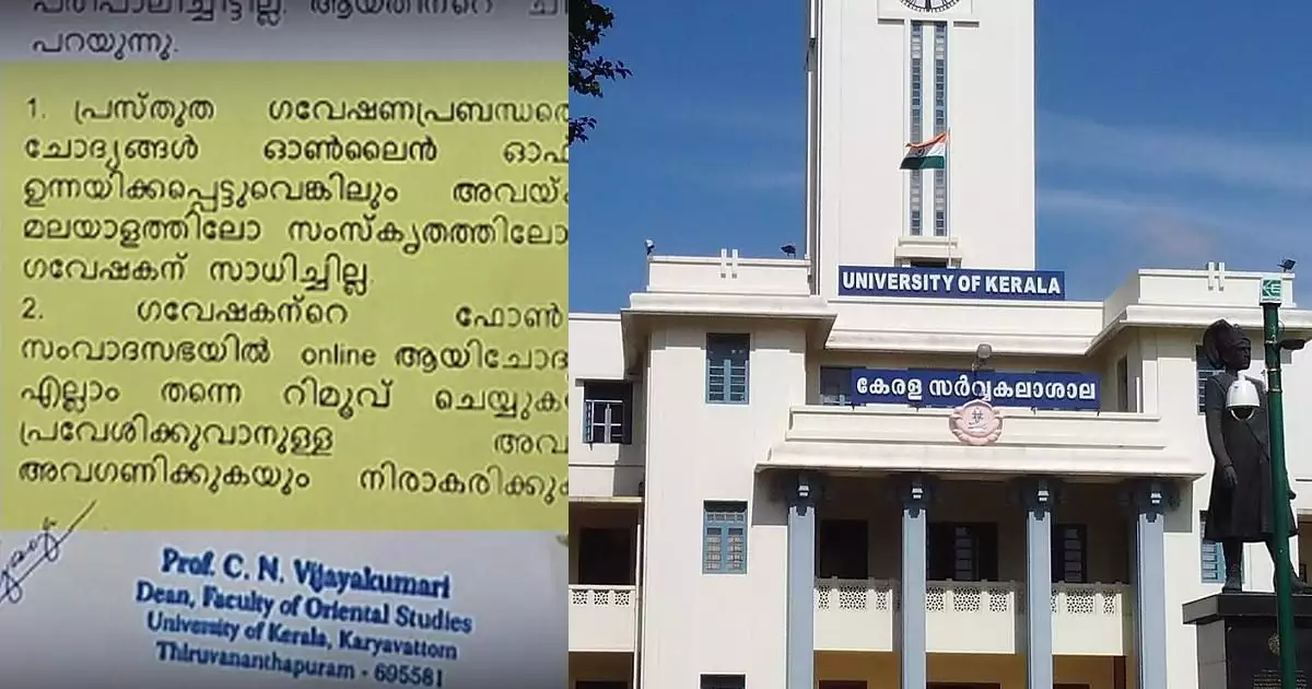 എംഫിലില് തന്റെ ഗൈഡായിരുന്ന അധ്യാപിക തനിക്ക് സംസ്കൃതം എഴുതാനും വായിക്കാനും അറിയില്ലെന്ന റിപ്പോര്ട്ട് സര്വകലാശാലയ്ക്ക് നല്കിയെന്ന് വിദ്യാര്ഥി പറഞ്ഞിരുന്നു. തനിക്ക് പിഎച്ച്ഡി ലഭിക്കുന്നത് കാണണമെന്ന് പറഞ്ഞ് അധ്യാപിക ഭീഷണിപ്പെടുത്തിയെന്നും പുലയന്മാര്ക്കും പറയന്മാര്ക്കും പഠിക്കാനുള്ളതല്ല സംസ്കൃതമെന്ന് വിജയകുമാരി പറഞ്ഞെന്നും വിദ്യാര്ഥി ആരോപിച്ചിരുന്നു.