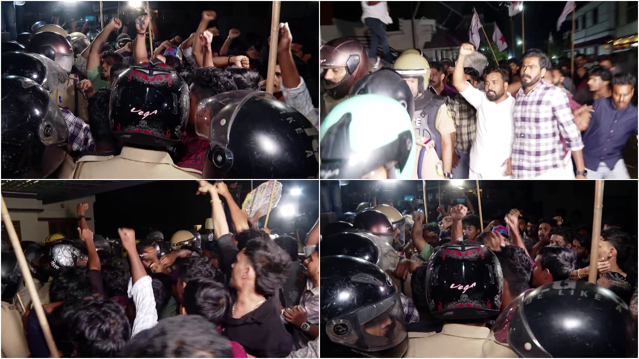 'പീഡന വീരന് ആദരാഞ്ജലികൾ'; റീത്തുമായി രാഹുലിൻ്റെ ഓഫീസിലേക്ക് മാർച്ചുമായി ഡിവൈഎഫ്ഐ, തടഞ്ഞ് പൊലീസ്, പ്രദേശത്ത് സംഘർഷം