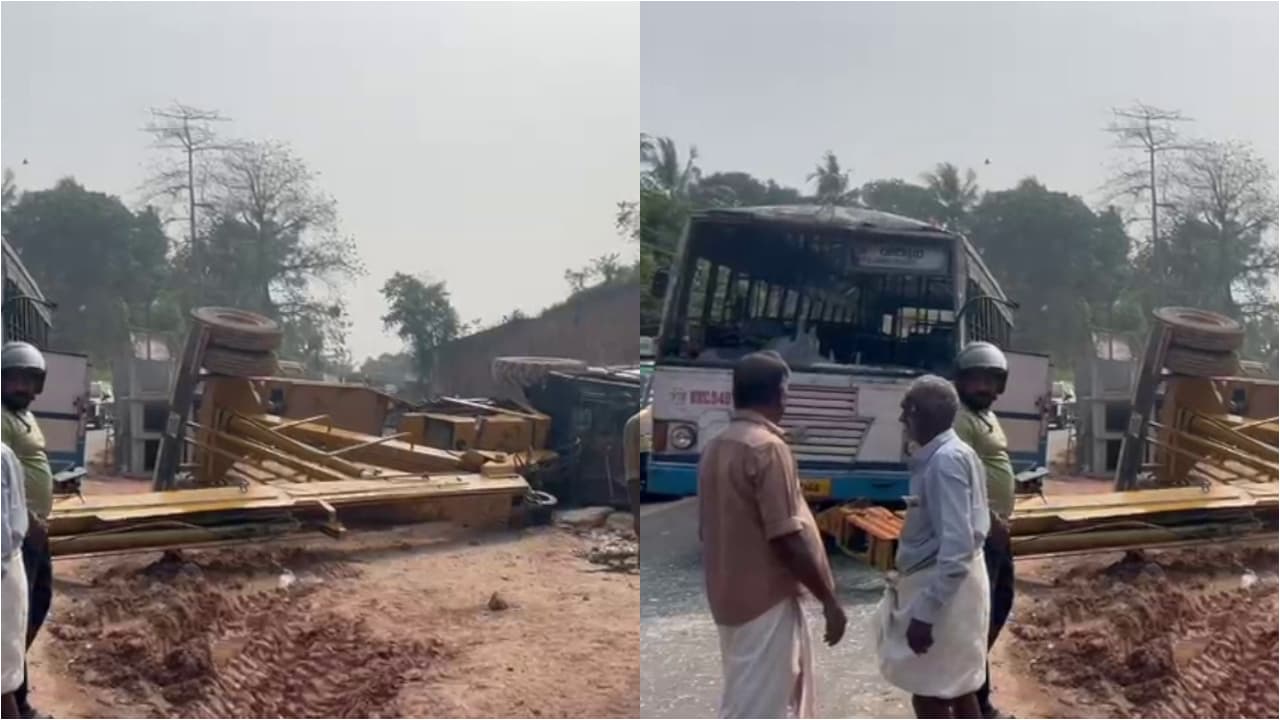 കെഎസ്ആര്ടിസി ബസും ക്രെയിനും കൂട്ടിയിടിച്ച് അപകടം; ക്രെയിൻ കുഴിയിലേക്ക് മറിഞ്ഞു, ഡ്രൈവര്ക്ക് പരിക്ക്
