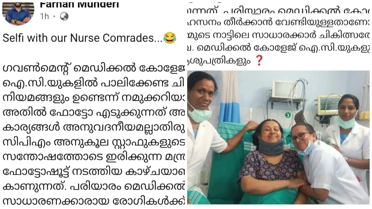 കണ്ണൂർ: ആരോഗ്യമന്ത്രി വീണാ ജോർജിനെതിരെ കെഎസ്യു പ്രചാരണം. പരിയാരം ആശുപത്രിയിൽ നേഴ്സുമാർക്കൊപ്പം ഉള്ള ചിത്രമാണ് പ്രചരിപ്പിക്കുന്നത്. ഐസിയുവിൽ പാലിക്കേണ്ട മര്യാദകളില്ലാതെ ഫോട്ടോയെടുത്തു എന്നാണ് ആക്ഷേപം. കഴുത്തിന് ഗുരുതര പരിക്കുള്ള മന്ത്രി ചിരിച്ചുകൊണ്ട് ഫോട്ടോയ്ക്ക് പോസ് ചെയ്തെന്നാണ് വിമർശനം.</p><p>ഇന്നലെ രാത്രി പത്തുമണിക്കാണ് കെഎസ്യു പ്രതിഷേധത്തിനിടെ കഴുത്തിലേറ്റ ക്ഷതത്തിൽ വിദഗ്ധ ചികിത്സക്കായി ആരോഗ്യമന്ത്രിയെ പരിയാരം മെഡിക്കൽ കോളേജിലേക്ക് എത്തിച്ചത്. എംആർഐ സ്കാനിങ് അടക്കം വിശദപരിശോധന നടത്തി. ഗുരുതര പ്രശ്നമില്ലെന്നാണ് കണ്ടെത്തൽ. കഴുത്തിലെ ക്ഷതം മൂലം തലയ്ക്കു പുറകിലും വലതുകൈയിലും വേദന പടരുന്നത് മരുന്നുമൂലം നിയന്ത്രിച്ചതായി മെഡിക്കൽ സംഘം പറയുന്നു. എംആർഐ റിപ്പോർട്ട് പ്രകാരം കഴുത്തിലെ കശേരുക്കൾക്കിടയിലെ ഡിസ്കുകൾ നാഡീമൂലങ്ങളിൽ അമർന്നുള്ള സമ്മർദ്ദമാണ് വേദനയ്ക്ക് കാരണമെന്നാണ് കണ്ടെത്തൽ. അടിയന്തര ശസ്ത്രക്രിയയുടെ ആവശ്യമില്ല. നിരന്തര നിരീക്ഷണം ആവശ്യമുള്ളതിനാൽ പരിയാരം മെഡിക്കൽ കോളേജിലെ ഐസിയുവിൽ തുടരാനാണ് ഡോക്ടർമാരുടെ നിർദ്ദേശം